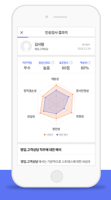 인성검사를 통해 개인 성격 특성에 대한 세밀한 분석은 물론 지원 직무와의 직무적합도 (Job-Person fit)도 파악하실 수 있습니다.
